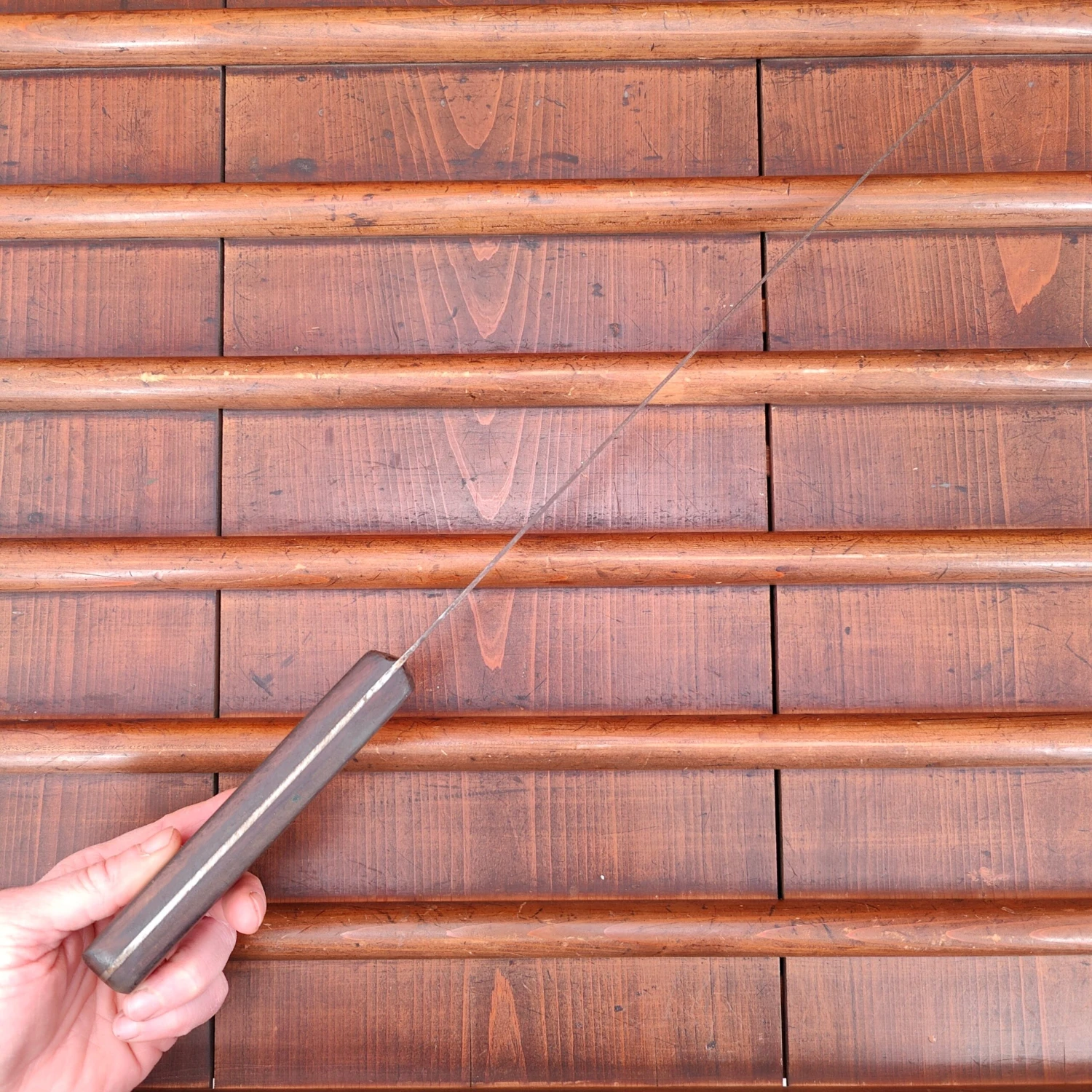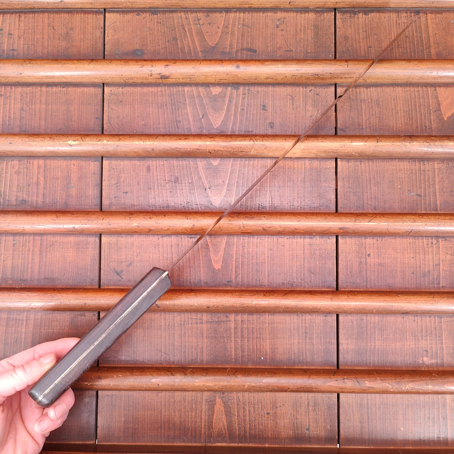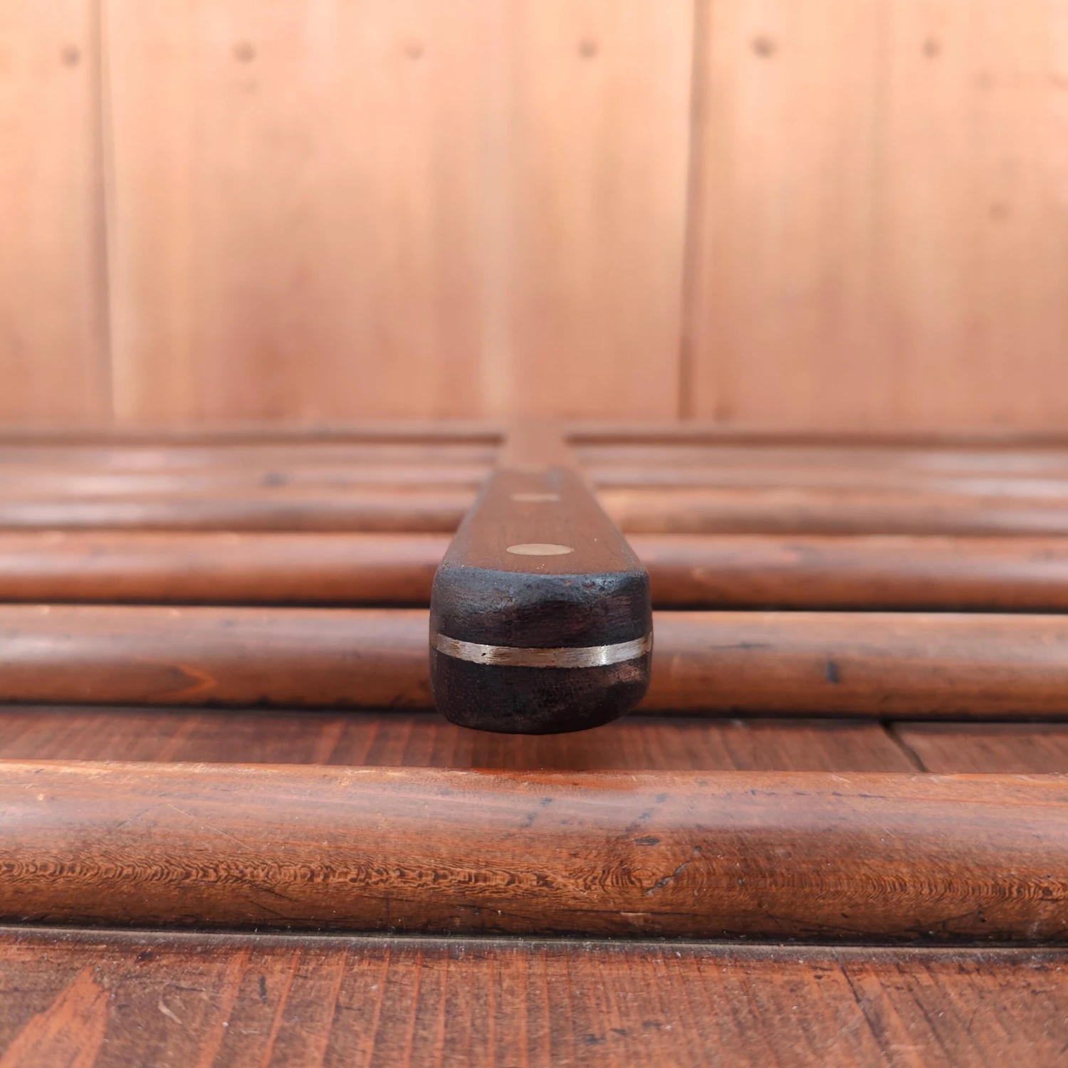 Unmarked but certainly American round tip slicer with carbon steel blade and rosewood handle from approx the 1930’s to 60’s.