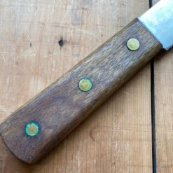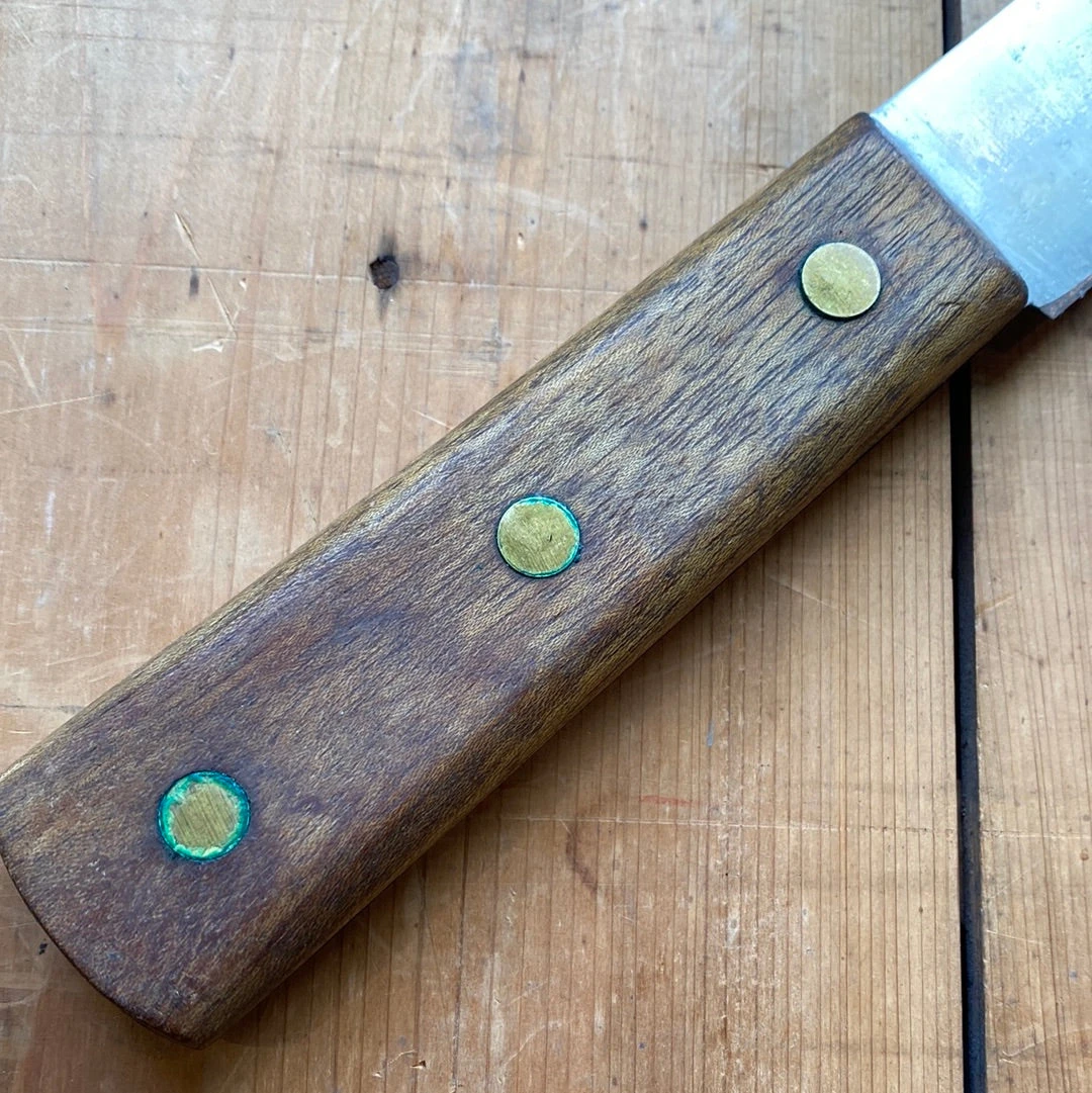 Unmarked but certainly American carbon steel scimitar with rosewood handle scales and brass rivets. Blade has been sharpened in some but still has lots of life left and comes with a fresh edge.