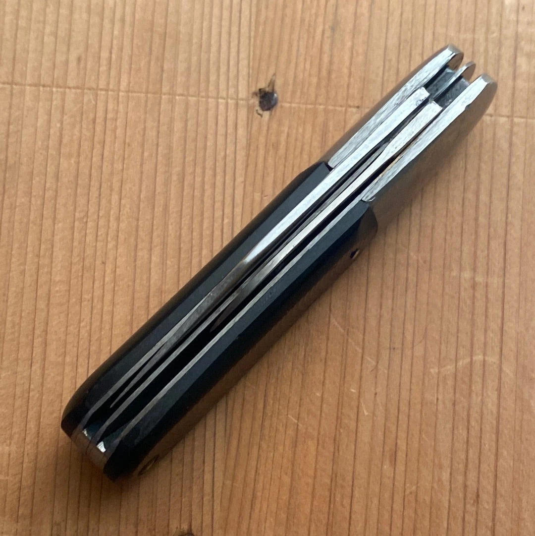 Main Blade has been sharpened in some and the spring is weak but no wiggles when open.