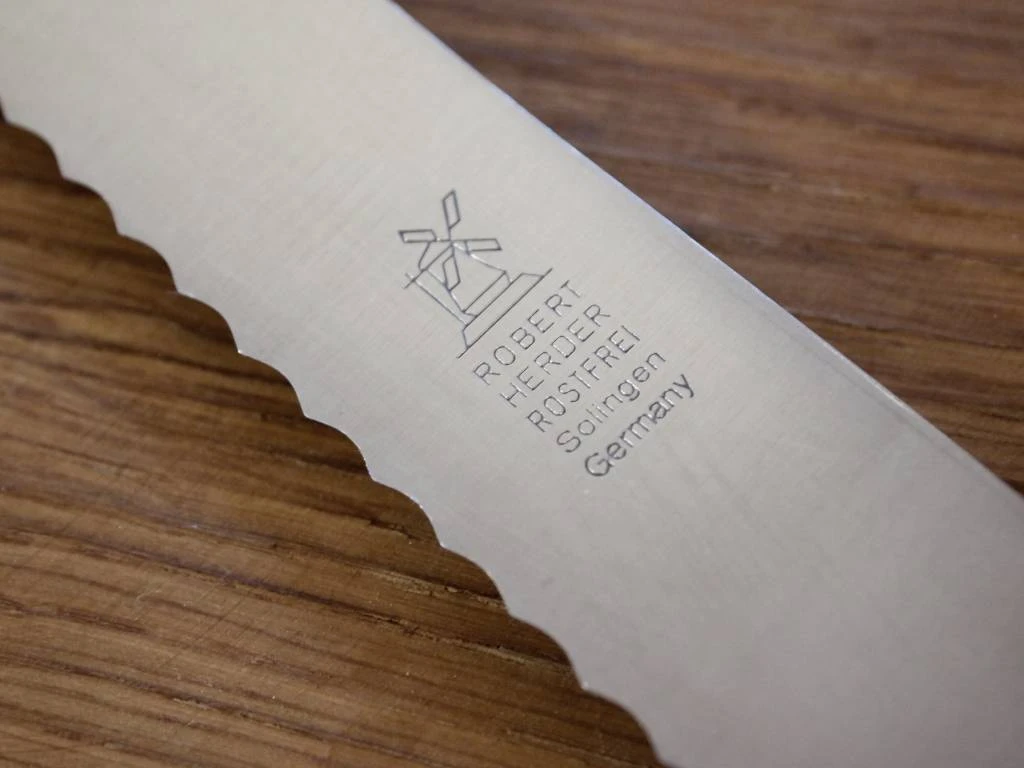 Robert Herder Windmühlenmesser knives are made in Solingen, Germany, and still utilize old hand-work techniques. Their fine, hand-ground blades are extremely light and ground thin. They offer a great cutting feel that is not possible with chunky, mechanized-ground blades. Paired with a slight convexity, it makes for reduced friction and sticking during cutting.