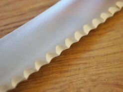 The serrated edge of this bread knife is polished and ground into the blade by hand, providing smooth and precise cutting feel. The cherry handle is also hand-shaped and sanded to fit comfortably in your hand. This shape of bread knife comes from the silhouette of Windmühlenmesser bread knives from the ’20s.