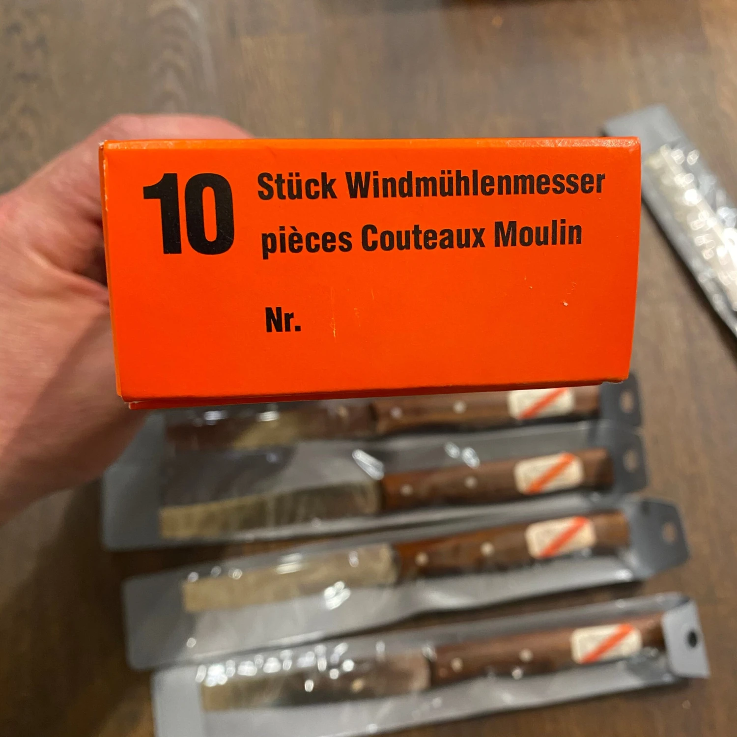 Unused vintage 1960’s-70’s era Robert Herder Windmuhlenmesser tomato knives made for the US market. The current president of Robert Herder confirmed the age of these with the specific short windmill blades on the stamp (a mistake from a tool maker doing the stamp) and the hand stamped item number on the box (she would stamp these boxes as a kid in the family knife works on vacations from school). A great time capsule here and testimony to the high quality standards that Robert Herder Company still holds.