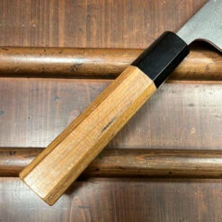 Yoshikane’s hand forged SKD semi-stainless core with stainless nashiji finished stainless cladding and octagonal teak handle with horn ferrule.